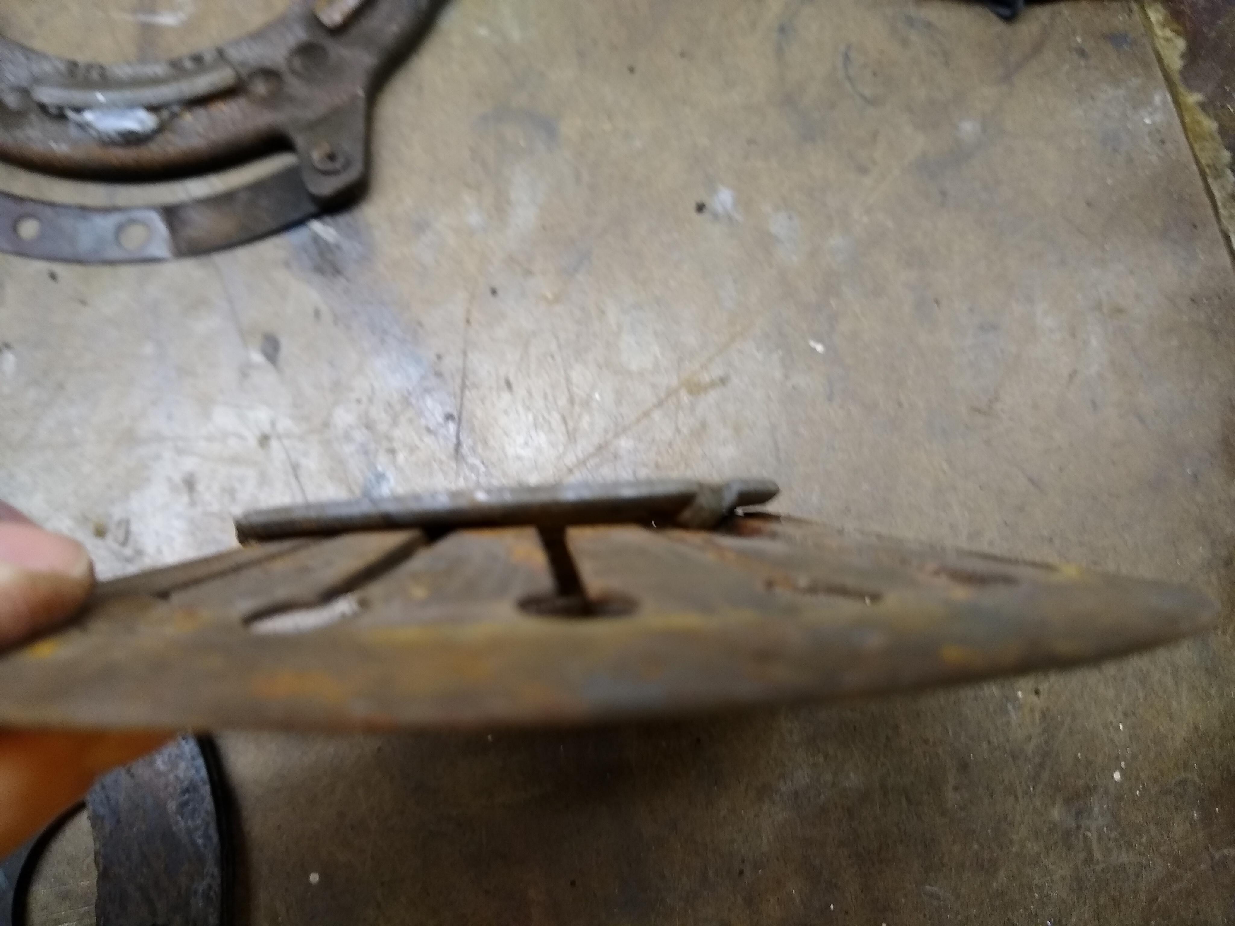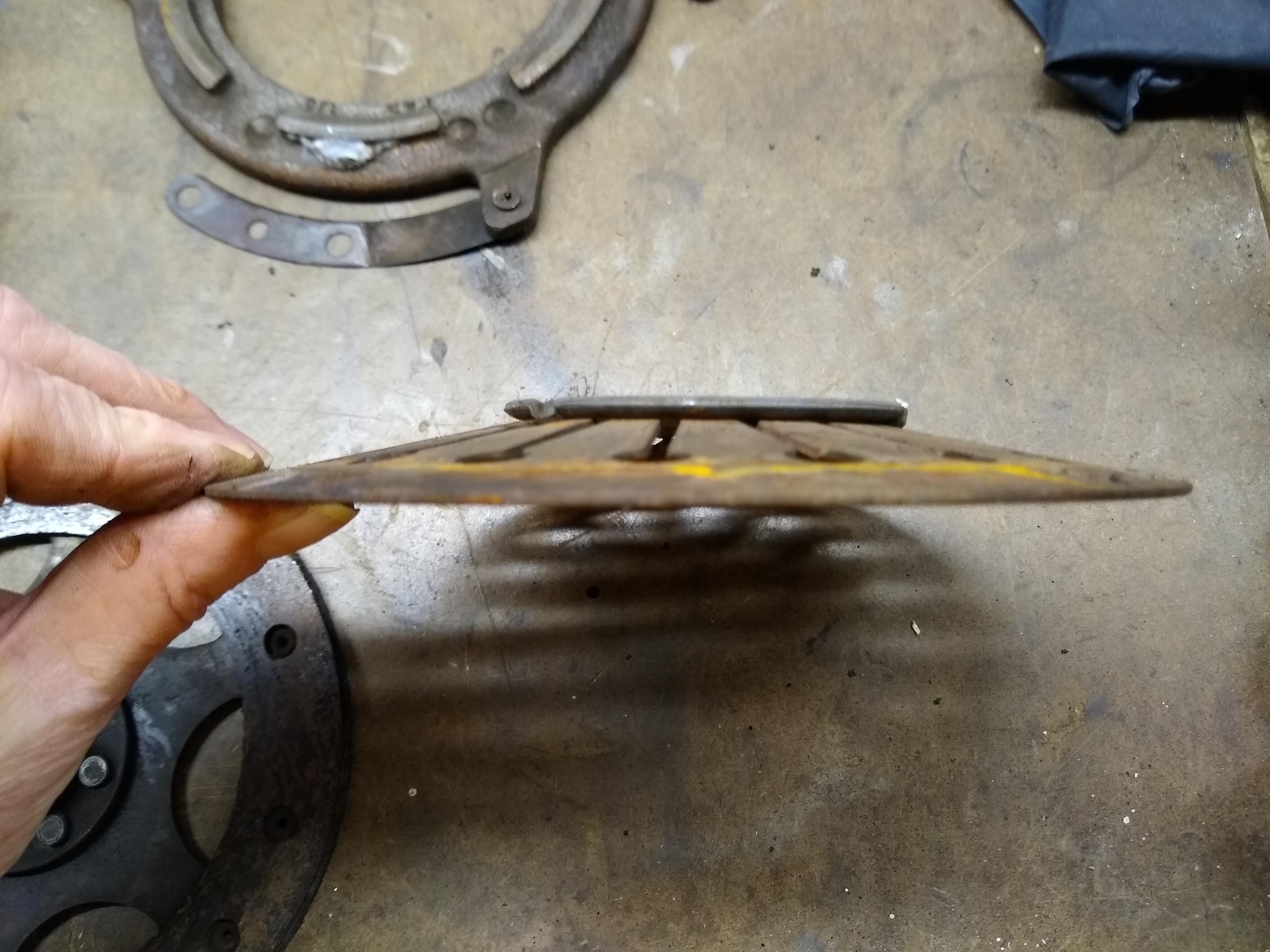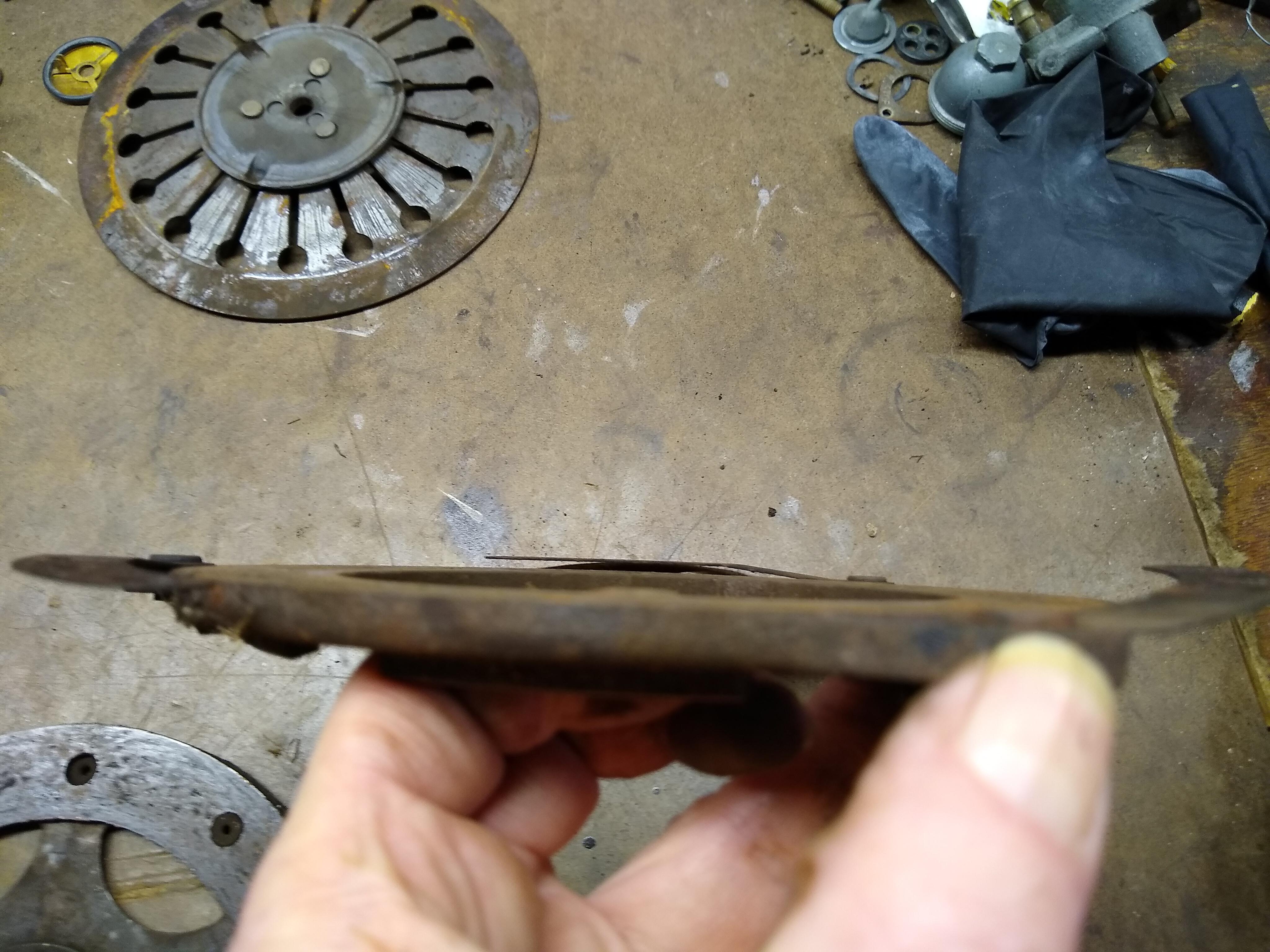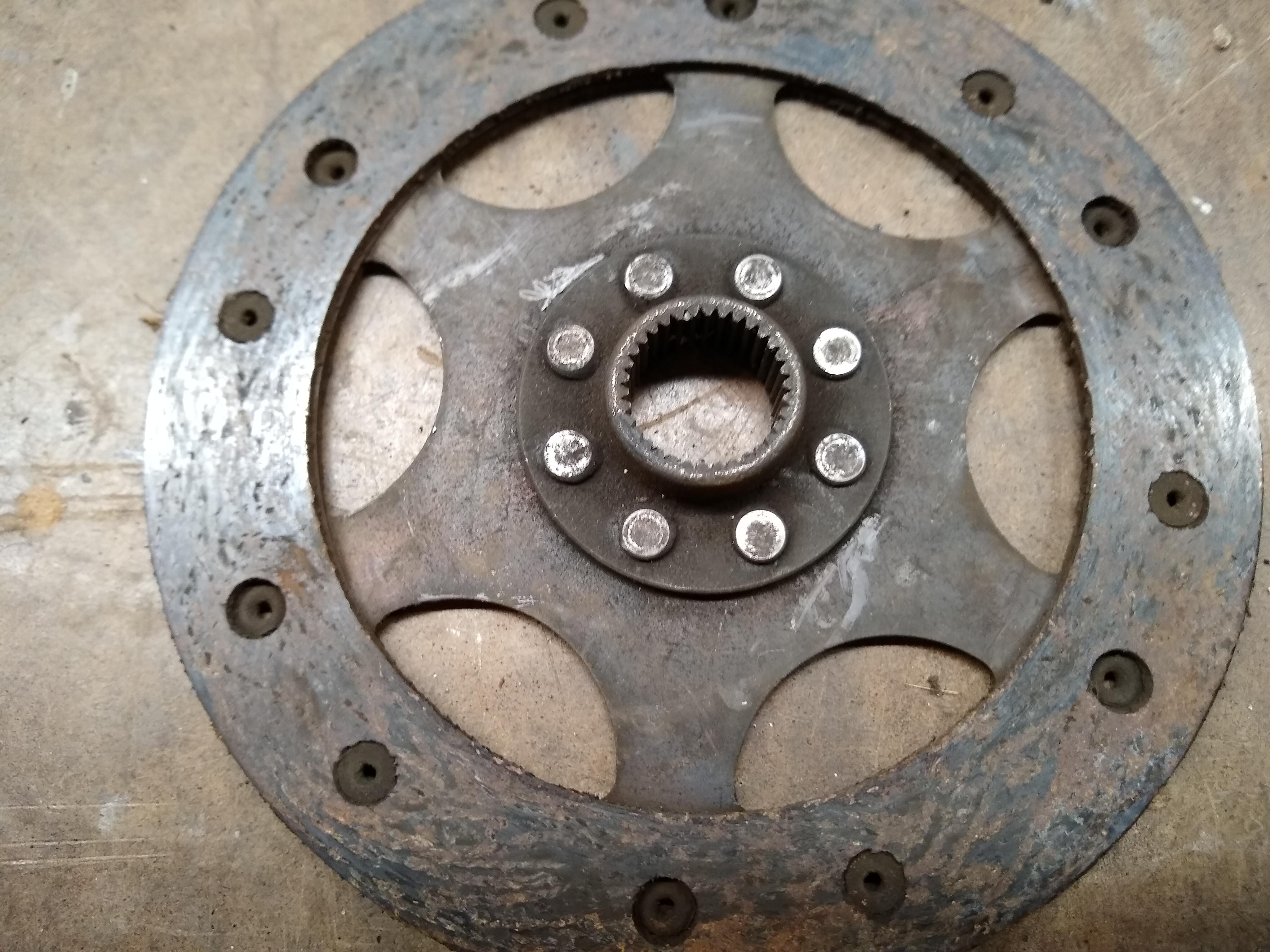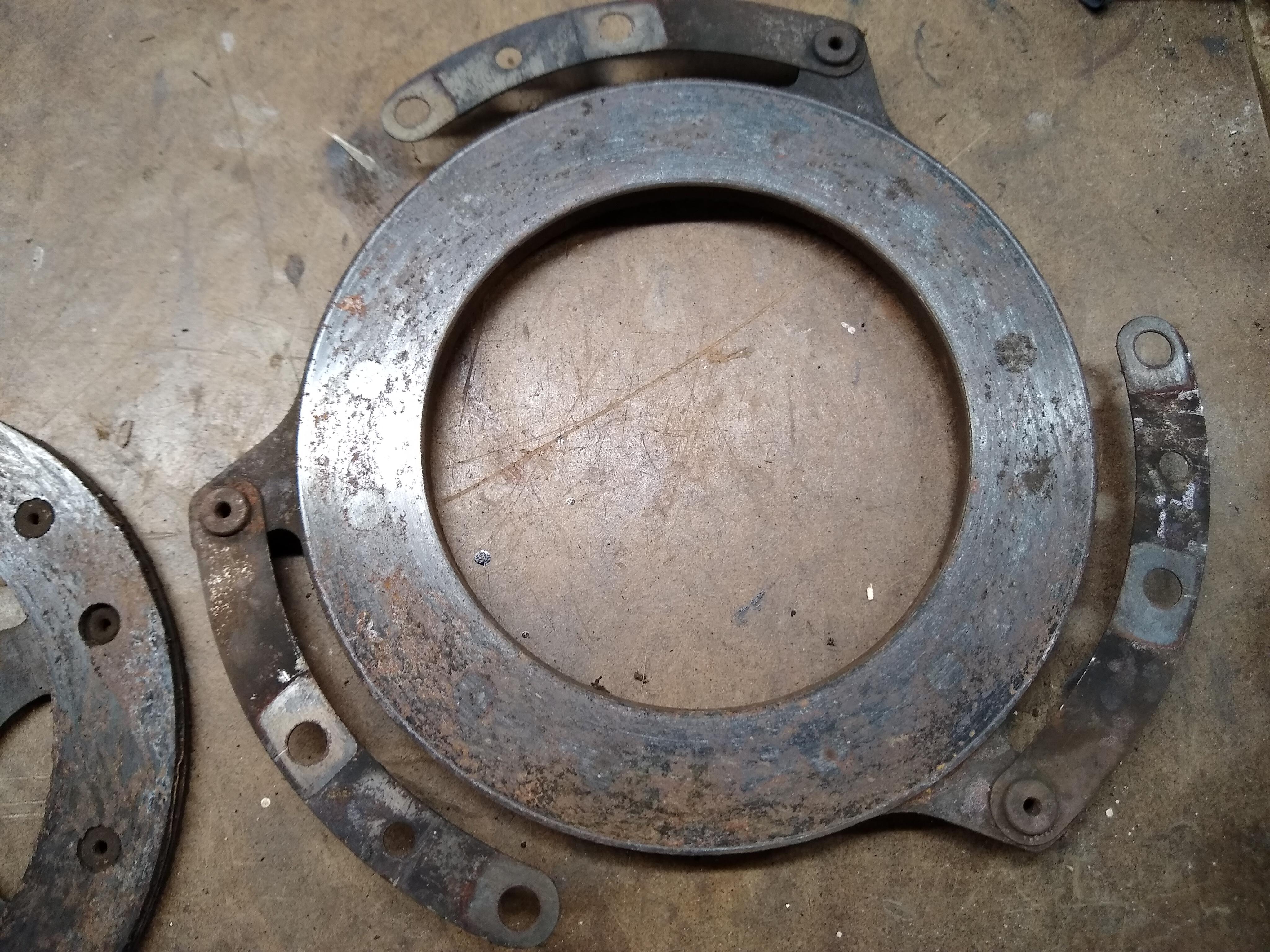 Some surface rust all around on everything but no pitting. Diaphragm spring is a bit lopsided / squashed on one side. You can see where the tab on the center hub has shifted out of place. Two of the tabs on the pressure plate have flattened out. Friction ring material is starting to separate / flake apart a bit. Flywheel is rusty but the teeth all look fine.